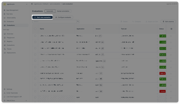 To start an evaluation, navigate to the Evaluations page and click the Start new evaluation button. A modal will appear, allowing you to setup the evaluation.