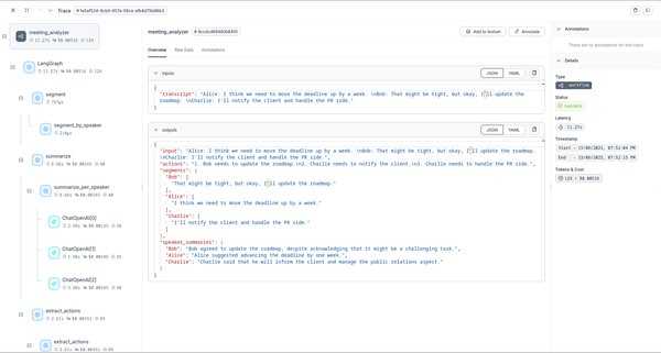 Here's a complete example showcasing a meeting transcript analysis workflow with Agenta instrumentation: